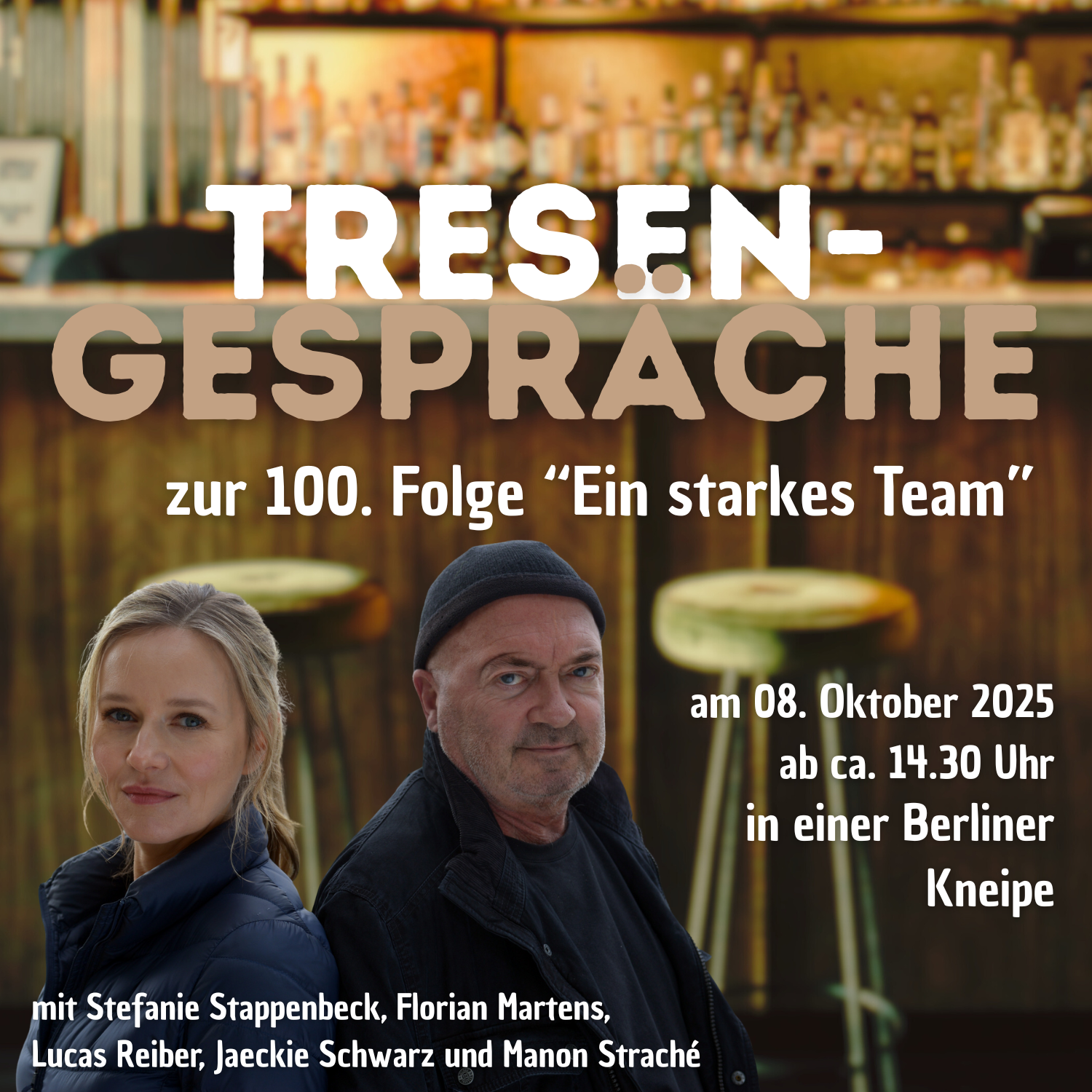 Anlässlich der 100. Folge des Berlin-Krimis „Ein starkes Team“, die am 25.10.2025 um 20:15 Uhr im ZDF zu sehen sein wird, wird zu Tresen-Gesprächen mit Cast & Crew eingeladen. Denn eines hat sich seit damals nicht geändert: Otto trägt Mütze und die besten Gespräche führt man am Tresen – mit einem frischen gezapften Bier in der Hand!